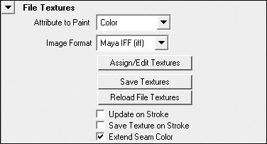 Figure 14.122. The 3D Paint Tool Settings window includes many controls that determine the look of your brush strokes.  | 3. | Scroll down until you see the File Textures section (Figure 14.123).