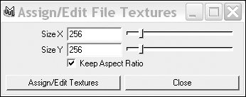 The Assign/Edit File Textures window appears. You can increase the resolution of the texture here if you need a highly detailed texture. The default of 256 by 256 will suffice for now (Figure 14.124).