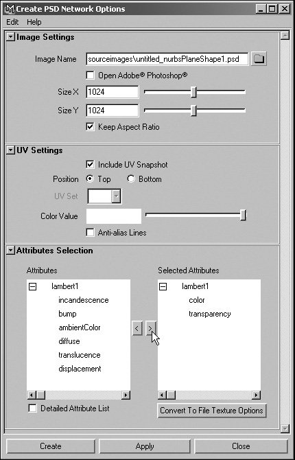 The dialog box closes, and Maya saves the PSD file to the sourceimages folder in your current project directory.