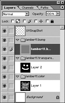 | 6. | Click the eye icon next to the lambert1.transparency layer set and the UVSnapShot layer so that they're hidden.