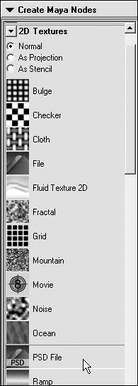 | To use an existing layered PSD file in Maya: 1. | Open the Hypershade, and, in the Create bar, expand 2D Textures.