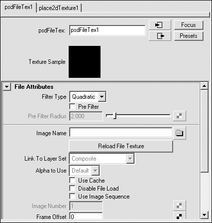 Figure 14.140. A PSD file node appears as psdFileTex1 in the Work Area.  | 3. | Double-click the psdFileTex1 node to open its Attribute Editor.