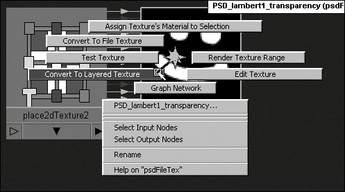 Figure 14.145. Right-click psdFileTex, and select Convert To Layered Texture from the marking menu.  Several new nodes appear in the Work Area. For each layer set in the PSD file, a new psdFileTex node is created (Figure 14.146).