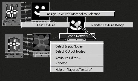 Figure 14.147. Click and drag the nodes to rearrange them.  | | | 4. | Right-click the layeredTexture node, and select Graph Network from the marking menu (Figure 14.148).