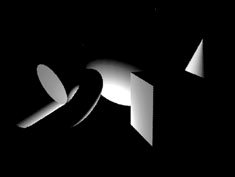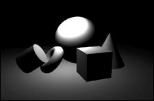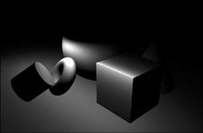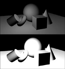 | Tips The Ambient Shade attribute of the ambient light affects the direction of the light source. If Ambient Shade is set to 0, light comes from all directions (Figure 15.27). If it's set to 1, light comes from the source itself, acting similarly to a point light (Figure 15.28). You must be careful when adjusting this attribute because the lower the number, the flatter the image appears. Figure 15.27. The Ambient Shade attribute is set to 0, flattening the scene.  Figure 15.28. The Ambient Shade attribute is set to 1, making the light similar to a point light.  To change an ambient light's Ambient Shade attribute: 1. | Start where the last task left off, with an ambient light selected and your IPR render refreshing a region.