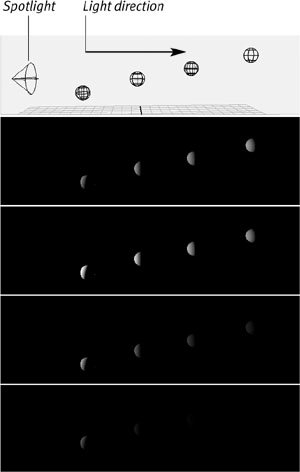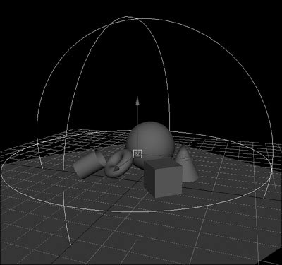 | A spot light has a number of attributes that you can change. Following are definitions of some of these attributes: Cone Angle The larger the number you input here, the wider the cone (and thus the illuminated area) will be (Figure 15.44). Figure 15.44. The default cone angle on top; the same light position but with a larger cone angle on the bottom.  Penumbra Angle Adjusting the penumbra angle softens the edge of the spot light by blurring it. A negative number blurs inside the edge of the cone; a positive number blurs outside the edge of the cone (Figure 15.45). Figure 15.45. Adjusting the penumbra angle blurs the edge of the spotlight. The top light has a setting of 0; the bottom light has a setting of 7.  Dropoff This attribute adjusts the intensity of the light from its center out to its edge. Raising the value results in a soft gradation from the center to the edge (Figure 15.46). Figure 15.46. Dropoff adjusts the intensity of the light from its center out to its edge. The light at the top has a default setting of 0; the light at the bottom has a setting of 8.  Volume light Volume lights fill an area with light. By default, they illuminate at full intensity at their center and fade off at the edge. Volume lights brighten areas with greater control than a point light, and they're also useful for creating shafts of light. To create a volume light: 1. | Open the practice.mb file.