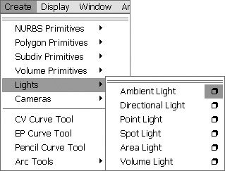 | Maya uses six light types: ambient, area, directional, point, spot, and volume. You can combine these light types to produce just about any lighting scenario. A Maya scene must include at least one light, or objects will be in complete darkness. Most scenes use many different kinds of lights, because each is suited to different uses. The following are the different light types and some of their common uses: Ambient Produces a uniform, non directional light throughout the scene (Figure 15.15). You should keep this type of light to a minimum, because the more you use it, the flatter and more devoid of contrast the scene will appear. Examples of ambient light include: Figure 15.15. The Ambient Light icon.  Area Two-dimensional, rectangular light source that emits light from the entire rectangle in the direction of the normal (Figure 15.16). Examples of area light include the following: Figure 15.16. The Area Light icon.  Directional Parallel light rays that illuminate the whole scene evenly from one specific direction (Figure 15.17). Examples of directional light include: Figure 15.17. The Directional Light icon.  Point Radiates light out from its center in all directions. The farther an object is from this light, the less it's illuminated (Figure 15.18). Examples of point light include: Figure 15.18. The Point Light icon.  Spot Lights an area within a variable cone shape. The light comes from the center point and travels in a specified direction (Figure 15.19). Examples of spot lights include: Figure 15.19. The Spot Light icon.  Flashlights Street lamps Headlights Spotlights
