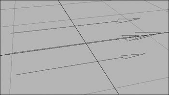 Figure 15.34. Scaling the area light to a strip produces a tube of light.  | Directional lights Directional lights are a lot like area lights, but they're infinitely large. They produce a wall of light in one direction, evenly illuminating the entire scene with light from that direction. The position of a directional light doesn't matter, because the light it sheds is entirely uniform and isn't obscured by objects. Directional lights work great for representing sunlight and moonlight. They also work well when your objects are far from your light source. In these cases, the light rays coming from the source to your scene are nearly parallel. As a result, the characters aren't likely be struck by light from a different angle because they're moving. Directional lights also make good fill lights, because they evenly illuminate without the flattening effect of an ambient light. To create a directional light: 1. | Open the practice.mb file.
