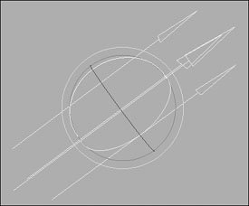 A directional light is created at the origin of the scene. The default direction points down the z axis in the negative direction (Figure 15.35). The perpendicular light rays follow a horizontal direction by default (Figure 15.36).