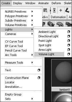 Figure 15.47. Select Lights > Volume Light from the Create menu to create a volume light at the scene's origin.  | 3. | Scale the volume light until it surrounds the objects you want to illuminate (Figure 15.48).