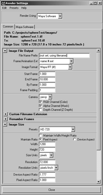| Tips You can click and drag in the FCheck window from left to right to scroll through an animation. You can use FCheck to view a batch render in progress by choosing View Batch Render from Maya's Render menu. Common render settings The Common tab of the Render Settings window allows you to view and set various render options (Figure 16.40). The upper portion of the tab displays the folder that files will be rendered to, the filename (and range, if rendering an image sequence), and the image size. Below this, you can adjust a number of render settings common to all renderers. For example, if you want to render from a camera you've created, you should select it from the Camera drop-down menu. To batch-render a sequence of frames, you need to set the first and last frames. Figure 16.40. The top portion of the Common tab displays information about the file(s) that will be rendered, and the lower portion allows you to change various settings.  You can also use the Common settings to change the filename and file format that will be used for your rendered images. Image formats like Maya's IFF allow you to render single images or image sequences for compositing in another program, whereas animation formats like AVI let you create a single file that contains your entire animation. You'll also need to choose a resolution at which to render. The resolution of an image is its size in pixels, usually given in the format [width] x [height]: for example: 640x480, which is read as 640 by 480. The higher the resolution, the longer the image will take to render. The resolution you should choose for your images depends on their final medium. If you're creating a small image for a Web site, you might use the 320x240 preset. If you plan to put the images on NTSC video, you'll probably use 720 by 486. For printing, however, you're likely to need a much higher resolution. If you want to print an 8-by-10-inch image at 300 dpi (dots per inch), you'll need a resolution of 2,400 by 3,300 pixelswhich will take a long time to render. - To open the Render Settings window: