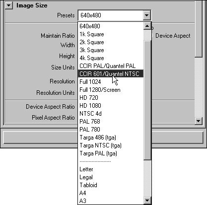 Figure 16.43. Maya provides a wide variety of Image Size presets. You can also adjust the image size settings manually.  This is a good choice if your image is going to end up on NTSC video.