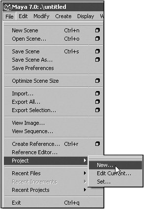 | Because of Maya's complexity and the numerous files that may be produced for each project, an organized file structure is essential. Maya makes building this structure easier by allowing you to create a special folder set called a project. Creating a new project automatically sets it as the working project, so Maya knows which folders to put your newly created files in, and where to start looking when you open pre-existing files. However, if you work on multiple projects, you'll need to set the project whenever you switch back and forth. To create a new project: 1. | Choose File > Project > New (Figure 1.38).