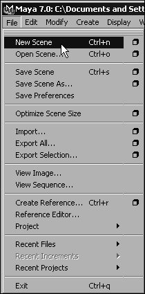 Figure 1.42. Maya opens with a new scene by default. If you've saved this scene or if you'd to start over, select File > New Scene.  Tip To save a scene: 1. | Choose File > Save Scene.
