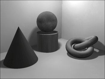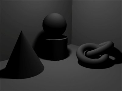 Figure 16.101. Be sure to do a test render without global illumination to make sure the scene looks the way it should.  The lighting should be fairly dark, because the scene will get significantly brighter when the reflected light from global illumination is calculated.
