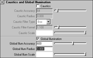 | 3. | In the Render Settings window, expand the Caustics and Global Illumination section. Set Global Illum Accuracy to 600 and Global Illum Radius to 3.0 (Figure 16.103).