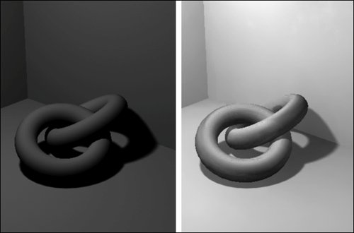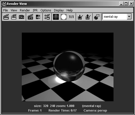 | Mental Ray is similar in functionality to the Maya Software renderer, but it's generally faster when rendering the same scene using equivalent settings. It also provides advanced rendering features such as caustics and global illumination, which can simulate realistic light effects. However, as with raytracing, the calculations required to create this level of realism result in longer render times. In addition, Mental Ray can't be used to render Paint Effects or any of the new toon effects. Global illumination is a method of calculating lighting that is more realistic but slower than Maya's default method. When you use global illumination, virtual light rays can bounce off objects and illuminate other objects. Without global illumination, objects can only be lit directly by lights. Because global illumination is closer to how light works in the real world, using it can result in more realistic-looking renders (Figure 16.94). Figure 16.94. This scene has been lit with a single light. The image on the left was rendered using the Maya Software renderer, and the image on the right was rendered using global illumination in Mental Ray.  Caustics have an effect similar to that of global illumination, but the indirect lighting comes only from the specular highlights of objects, not their diffuse or overall lighting. This often creates more distinct patterns of light cast onto other objects, rather than the more general effect of global illumination. Caustics can be reflective (Figure 16.95) or refractive (Figure 16.96). Figure 16.95. Reflective caustics cause light to reflect from the ring onto the plane.  Figure 16.96. The light pattern on the checkered plane is caused by refractive caustics.  Mental Ray can produce very photorealistic renders, but this realism requires a long rendering time. Be aware that although using global illumination and/or caustics can yield fantastic results, it's often more efficient to find a way to approximate your desired effect. For example, rather than using global illumination to simulate light bouncing off the ground and then illuminating your object, you could create a low-intensity directional bounce light, aimed upward from the ground. To create caustics: 1. | Create a refractive sphere on a plane by following the instructions described in "To create refraction," earlier in this chapter.