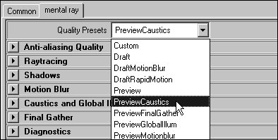 Figure 16.97. The PreviewCaustics preset automatically sets a number of Mental Ray's settings.  This option automatically turns on raytracing and caustics and sets various other Mental Ray settings to provide a preview-quality render for scenes with caustics.