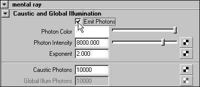 | 5. | In the Attribute Editor, expand the Mental Ray > Caustic and Global Illumination section, and check the Emit Photons check box (Figure 16.98).