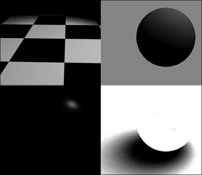 Figure 16.111. From left to right and top to bottom: the Background, Diffuse, Specular, and Shadow layers.  | Tips To adjust the Render Settings for any render layer, click the small Render Settings icon to the left of the layer's name . For each attribute you want to change independently of the other layers, right-click the name of the attribute and select Create Layer Override from the context menu. You can select a layer and render it in the Render View window, or render the masterLayer to see the entire scene. |