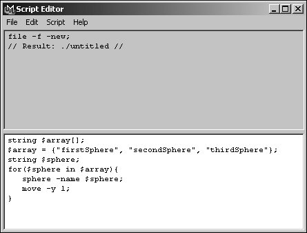 | A simple MEL script may perform a set of specific tasks once and perform them in the same way every time it's run, but you can also create more complex scripts using loops and if statements. Loops allow you to execute a group or block of commands repeatedly, and if statements allow you to execute a block of commands only under specified conditions. Blocks of commands are contained within curly braces, and each command should be followed by a semicolon as usual. To use a for-in loop: 1. | Declare an array, and set its values: