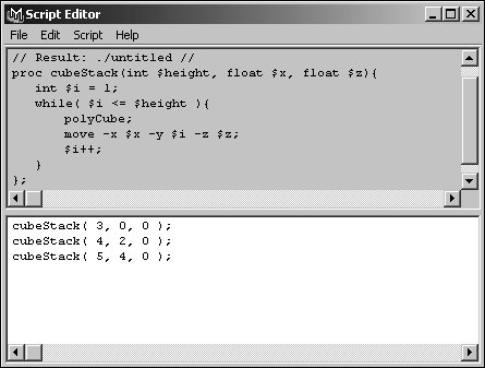 | Procedures provide a method of reusing blocks of code. At minimum, a procedure consists of a name and a block of code, or body, that is executed when the procedure is called. You must define a procedure before you use it, similar to the way you define a variable. A procedure's definition begins with the keyword proc, followed by the procedure's name and then a bracketed code block. Procedures may also have one or more arguments. Arguments are variables that must be defined in parentheses after the procedure's name. You can then use these variables within the body of the procedure, without assigning values to them. Their values are determined when you call the procedure. To call a procedure you've defined, simply use its name in a script, followed by the values for its arguments (if any) in parentheses. Procedures are local by default. Local procedures can only be accessed from the same script they're defined in. You can also define a procedure as being global by adding the global keyword before its proc definition. This allows it to be accessed from any script. To define a procedure: 1. | In the Script Editor, enter proc followed by the name of the procedure. For example: proc cubeStack.