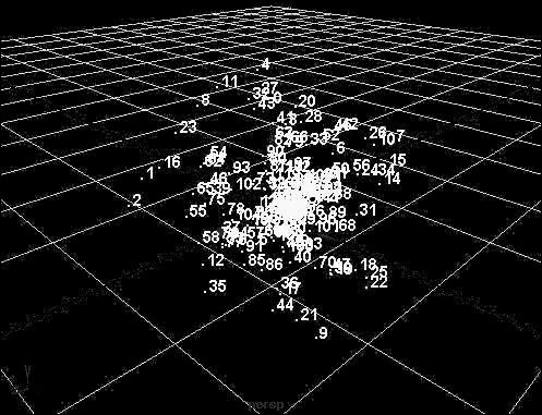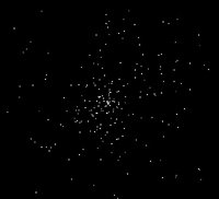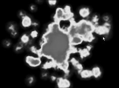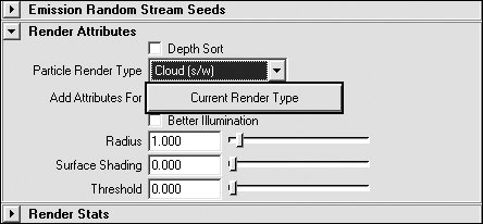 Figure 18.26. The rendered particles appear in a cloud-like shape, making for a fuller looking set of particles.  | Hardware render types Maya offers the following hardware render types for particles: Points Points render as dots on the screen (Figure 18.27). The radius is adjustable, but the dots remain two-dimensional. Figure 18.27. Points render as dots.  MultiPoint MultiPoints render as clusters of dots on the screen (Figure 18.28). Additional attributes include MultiRadius, which controls the size of each cluster, and MultiCount, which controls the number of dots in each cluster. Figure 18.28. MultiPoints render as clusters of dots.  Streak Streaks render as lines on the screen (Figure 18.29). Additional attributes include Size, Line Width, Tail Size, and Tail Fade. Figure 18.29. Streaks render as straight lines.  MultiStreak Like Streaks, MultiStreaks render as lines on the screen (Figure 18.30). MultiStreaks have the same attributes as Streaks, plus MultiCount and MultiRadius. Figure 18.30. MultiStreaks render as clusters of lines.  Sprites Sprites have an image file attached to them (Figure 18.31). From the Particles menu, select Sprite Wizard to choose the image file you want to use. Figure 18.31. Sprites appear as images and support opacity and alpha channels.  Spheres Spheres render as opaque spheres (Figure 18.32). You can assign any shader you want to a Sphere particle. Transparency is not supported. Figure 18.32. Spheres render as polygonal spheres that can be textured.  Numeric Numeric particles have a number value associated with them (Figure 18.33). These number values can represent static, dynamic, or per-particle attributes. This allows you to have single numeric values on particles that don't move and multiple number values on fully moving particles. Figure 18.33. Numeric particles appear with specified information pertaining to the particle. Numeric particles render as dots.  Software render types Maya offers the following software render types for particles: Blobby Surface Blobby Surface particles render as spheres that can appear to melt into one surface (Figure 18.34). Attributes include Radius and Threshold: Figure 18.34. Blobby Surfaces render as spheres but look as though they're melting or blending together.  Radius Determines the initial size of the particle. Threshold Determines how much the particles blend together. As the Threshold attribute increases, the radius of the particle diminishes, and the particle begins to blend with other particles.
