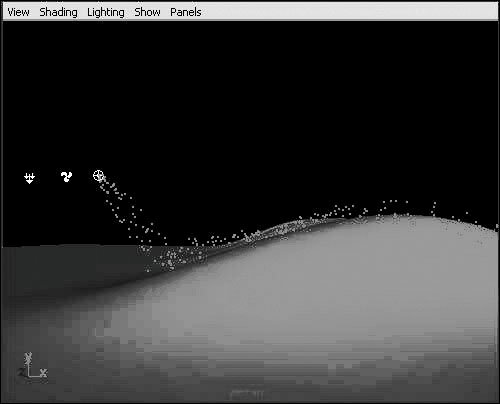 | If you had added a Gravity field to any of your particle objects, the particles would have fallen out of view because there was nothing in the scene to stop them. You can use the Make Collide command to tell Maya to make the particles collide with certain geometry. For example, for a scene in which you want fog to roll along the ground, you can create a particle object, attach Air and Gravity fields, and have the particles collide with the ground. The particles then will fall to the ground and be pushed along by the Air field. To create a particle collision: 1. | Create a particle object and attach an Air field, following the steps in the task "To attach a field to a particle object."