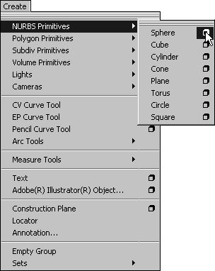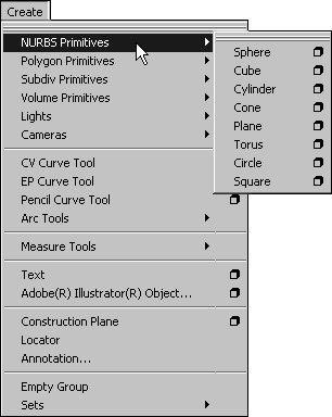 | NURBS primitives are useful, predefined curves and surfaces. Maya includes eight NURBS primitives: sphere, cube, cylinder, cone, plane, torus, circle, and square (Figure 3.10). The first six of these primitives are NURBS surfaces; the circle and square primitives are NURBS curves, which can be useful when you want to construct surfaces yourself. Figure 3.10. The eight NURBS primitives (left to right, from top): sphere, cube, cylinder, cone, plane, torus, circle, and square. Each primitive has a number of attributes, which you can change in its Options dialog box before you create the object (Figure 3.11). If construction history was enabled when the primitive was created, you can also adjust the properties after it's been created. To do so, select the node labeled makeNurb plus the name of the primitive from the Channel Box's Inputs section (Figure 3.12). Figure 3.11. A primitive's attributes can be changed in its Options dialog box. Figure 3.12. The construction history lets you change an existing primitive's attributes.  In this section, we'll show you how to create NURBS primitives and how to change some of their attributes both before and after the object has been created. Creating NURBS primitives NURBS primitives are found in the Create > NURBS Primitives submenu (Figure 3.13). You can create a primitive by selecting its name from this submenu or from the equivalent submenu in the Hotbox. You can also use the Surfaces Shelf to quickly create any of the primitive NURBS surfaces (Figure 3.14). Figure 3.13. You can create any of the NURBS primitives from the Create > NURBS Primitives submenu.  Figure 3.14. You can quickly create NURBS primitives by clicking their icons in the Surfaces Shelf.  When you create a primitive surface or curve, Maya places the object's center point at the origin of the scene (at the coordinates 0, 0, 0), which puts most objects half above the grid and half below it (Figure 3.15). The exception is the cone, whose center point is at its base and which appears to rest on the grid. Figure 3.15. When creating primitives, Maya places the center point of the primitive at the origin of the scene. To create a NURBS primitive using the main menu: 1. | Choose Create > NURBS Primitives.