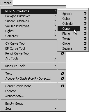 | 2. | Select the name of the primitive you want to create (for example, a cone) (Figure 3.16).