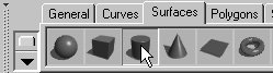 | To create a NURBS primitive using the Surfaces Shelf: - From the Surfaces Shelf, select the NURBS primitive icon for the object you would like to create (the cylinder is shown here) (Figure 3.18).