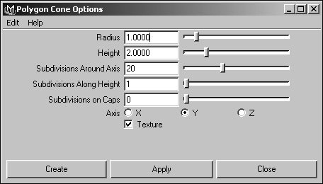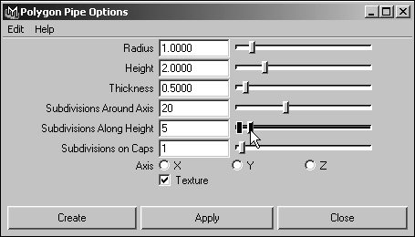 Figure 3.37. Maya places the center point of a newly created primitive at the origin of the scene. Tips If the Shelf isn't visible, open it by choosing Display > UI Elements > Shelf. By default, not all of the polygonal primitives are displayed in the Polygons Shelf; the prism, soccer ball and platonic solids are missing. To add any of these primitives to the Shelf, hold down and select the primitive from the Create menu. About polygon primitive attributes Like NURBS primitives, each polygon primitive has a number of attributes that you can set for the object before or after it's created. Changing these attributes affects various aspects of the object's appearance. The following are some important polygon primitive attributes: Radius As with NURBS primitives, the radius of an object is the distance from the center of an object to its edge, with two exceptions: With the torus, the radius is the distance from the center of its cross-section; for the helix, it's the radius of the cross-section. In all instances but the helix, adjusting the Radius attribute resizes the object proportionally on all three axes. Section Radius This attribute is only used by the torus polygon primitive. Adjusting the Section Radius changes its cross-section, fattening or slimming the torus's doughnut-like shape (Figure 3.38). Figure 3.38. Adjusting the Section Radius attribute fattens or slims the torus's shape. Subdivisions Height, Width, Depth These attributes adjust the number of times the height, width, or depth of the surface is divided. Adjusting these attributes adds or subtracts faces in the direction of the corresponding axis (Figure 3.39). Figure 3.39. Adjusting the Subdivisions Height attribute adds or subtracts polygons along the height of the object. Subdivisions Axis For primitives with a circular cross-section, like the sphere or the cylinder, this attribute adjusts the number of times the surface is divided around the center axis. Increasing the Subdivisions Axis adds faces to the object, and decreasing it removes faces (Figure 3.40). Figure 3.40. Adjusting the Subdivisions Axis attribute adds or subtracts polygons around the center axis of the object. Subdivisions Cap(s) Four polygon primitives have caps: the cone, cylinder, pipe, and helix. A cap is a piece of geometry that covers the hole at the end of a surface. The Subdivisions Cap(s) attribute adjusts the number of times the surface's cap is divided. Adjusting this attribute adds faces to or subtracts them from the object's cap, radiating out from the center (Figure 3.41). Figure 3.41. Adjusting the Subdivisions Cap(s) attribute adds polygons to or subtracts them from the object's cap(s). Changing a polygon primitive's attributes You change all of the polygon primitives' attributes in the same way. This section shows you how to change the Subdivisions Height attribute of a polygon primitive. You can follow the same steps to change other object attributes. The Subdivisions Height attribute is common to most of the polygon primitives, with the exceptions of the helix, the soccer ball, and the platonic solids. It determines the number of times the surface's height is divided. By raising the number, you increase the number of polygons along the height of the object (Figure, 3.42). If you lower the number, the number of polygons alone the height of the object is reduced (Figure 3.43). Figure 3.42. The pyramid on the right has had the value of its Subdivisions Height attribute increased to 12. Figure 3.43. The pyramid on the right has had the value of its Subdivisions Height decreased to 1, the minimum value. To set the Subdivisions Height attribute of a polygon primitive from the Create menu: 1. | Choose Create > Polygon Primitives.