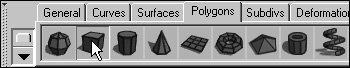Figure 3.36. The Polygons Shelf lets you quickly create most of the polygon primitives.  The primitive is created at the origin of the scene (Figure 3.37).