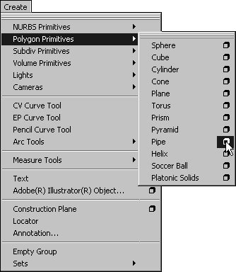 | Polygon primitives, like NURBS primitives, represent a collection of predefined surfaces. These surfaces can save you time in creating simple objects and give you a head start on creating more detailed shapes. Maya includes 12 polygon primitives (Figure 3.31). Six of these are similar to their NURBS or subdiv equivalents: sphere, cube, cylinder, cone, plane, and torus. The other six, new in Maya 7.0, are only available in polygonal form: prism, pyramid, pipe, helix, soccer ball, and platonic solids. Figure 3.31. There are 12 polygon primitives. Top row: sphere, cube, cylinder, cone, plane, and torus. Bottom row: prism, pyramid, pipe, helix, soccer ball, and platonic solids. You can change each of these primitives' default attributes in the Options dialog box before you create an object (Figure 3.32). Like NURBS and subdiv primitives, polygon primitives have a construction history that lets you adjust the properties of a polygon primitive after it's been created. The attributes associated with the construction history appear in the Inputs section of Channel Box under poly plus the primitive's name (Figure, 3.33). Figure 3.32. Each polygon primitive has attributes that you can set in its Options dialog box before creating the object.  Figure 3.33. Construction history gives you the ability to adjust a polygon primitive's attributes after it's been created.  This section covers creating polygon primitives, some important polygon primitive attributes, and how to change these attributes both before and after creating an object. Creating polygon primitives Polygon primitives are found in the Create > Polygon Primitives submenu. As with NURBS primitives, you can create polygon primitives from the main menu, the Hotbox, or the Shelf. Newly created polygon primitives are placed with their center point at the origin of the scene (at the coordinates 0, 0, 0). To create a polygon primitive using the main menu: 1. | Choose Create > Polygon Primitives.