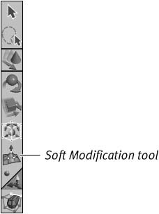 | The Soft Modification tool gives you the ability to sculpt, or smoothly modify, dense surfaces (Figure 4.72). Figure 4.72. Choose the Soft Modification tool from the toolbar.  You can use this tool for modeling as well as animation, because its parameters can be keyframed as long as the construction history has been enabled (see Chapter 1 for more about construction history). The Soft Modification tool's uses range from adjusting a dense facial mesh, to creating smooth terrain, to animating bulging muscles on a superhero's arm (Figure 4.73). Figure 4.73. Faces, smooth terrain, and muscles are just a few examples of what Soft Modification can do. The Soft Modification tool works by tapering the effect of adjusting points on surfaces. This allows smooth adjustments of a surface across several points. This technique is especially useful when you're working with dense surfaces: Without the Soft Modification tool, it would be far too timeconsuming to individually move the large number of components required to make smooth changes. As with the other translation tools, you can activate the Soft Modification tool and then select the area of the object you want to soft-modify. Or, if you select an object first and then choose the Soft Modification tool, the effect is automatically applied to the center of the object. The effect can be moved at any time, unless you delete the construction history. To soft-modify an object: 1. | Create a primitive polygonal plane (Create > Poly Primitives > Plane), give it Subdivisions Height and Width of 100, and scale it to about 20 times its original size (Figure 4.74).