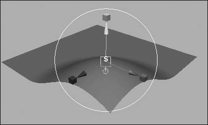 Figure 4.79. Using the Move tool, click and drag the Falloff manipulator.  | | | 8. | Press to open the Attribute Editor for the softMod (Figure 4.80).