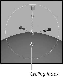 Figure 4.77. The Cycling Index is a circle with a line through it under the softMod manipulator. Click the Cycling Index to toggle on the Falloff manipulator.  | 6. | Click and drag the red circle surrounding the Falloff manipulator to increase or decrease the drop-off area (Figure 4.78).