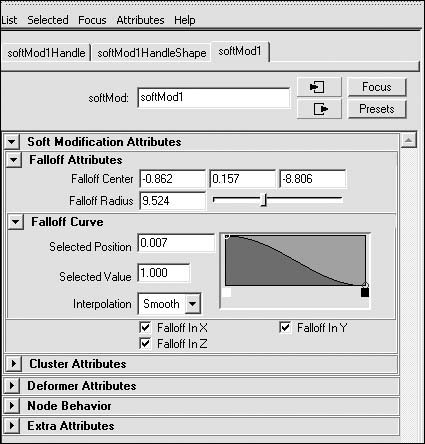 Figure 4.80. Edit the falloff curve in the softMod Attribute Editor.  | 9. | In the Falloff Curve section of the Attribute Editor (Figure 4.81), click the ramp to create a new edit point (Figure 4.82).