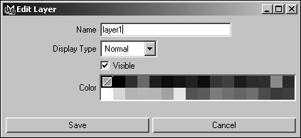 Figure 5.44. The Edit Layer dialog box lets you change an object's name, display type, and color. You can easily change the display type from the Layer Editor as well.  | 2. | Type a descriptive name for the layer in the Name field.