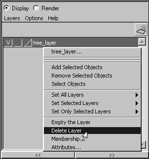 Figure 5.49. You can delete a layer by right-clicking it and choosing Delete Layer from its pop-up menu.  The layer is removed from the Layer Editor. Objects in the layer aren't deleted.