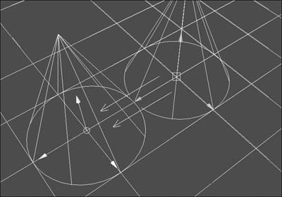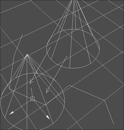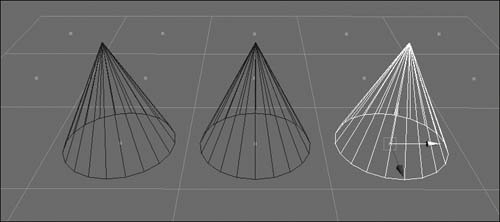 Figure 6.48. Any selected point can be snapped to any edit point, CV, or face center.  | Tips Although you can use the left mouse button when snapping, using the middle mouse button prevents unwanted objects from accidentally being selected. New in Maya 7.0, Snap to Points can also snap to face centers. Turn on face component display by pressing , and snap away (Figure 6.49). Figure 6.49. These cones have been snapped to the face centers by using Snap to Points.  |