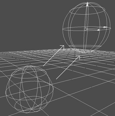 | The pivot point of the object snaps to the view plane where you clicked with the middle mouse button (Figure 6.45). Figure 6.45. Snapping to the view plane keeps the movement of your object perpendicular to the camera.  To snap a point on one surface to a point on another surface: 1. | Create two NURBS planes (Figure 6.46).