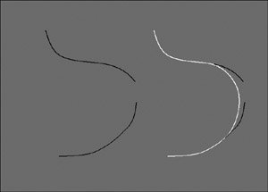 | Figure 7.23. The original curves on the left, and the new attached curve on the right. The original curves have been retained in this example.  Figure 7.24. The second curve has been connected to the first, instead of blended.  To detach a curve: 1. | Select a curve with the Pick mask set to Component: Parm Points mode.