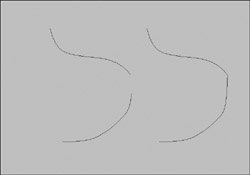 Figure 7.26. Two curves are created out of the detachment at the edit point.  | Tips If Keep Originals is selected in the Detach Curves Options dialog box, you'll have three curves after detaching-the original curve and two detached curves. Deselect Keep Originals before you detach to automatically delete the original curve (see the "Keep Originals' sidebar later in this chapter). If you perform Detach Curves on a closed curve, the curve becomes open with a start and end point where you detached them. Combined with Close Curves, this operation can reposition the seam on a circular curve (Figure 7.27). Figure 7.27. The original curve (left), after an edit point is added (middle), and the curve detached and reclosed (right). |