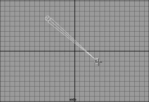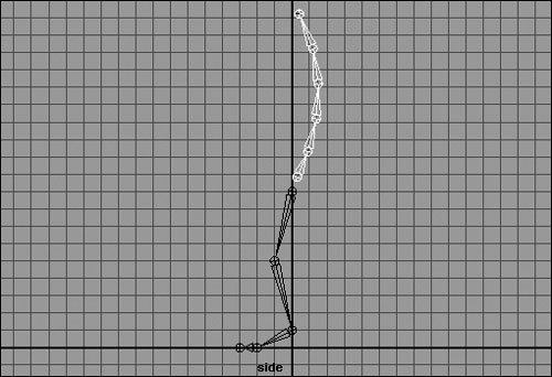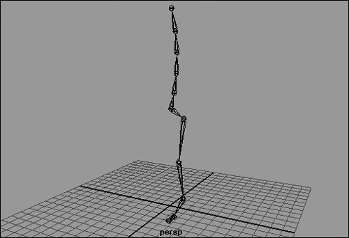 Figure 10.7. A spine is created from the bottom up. This makes the bottom joint the parent of the rest of the spine. The rest of the joints are beneath it in the hierarchy even though they're above it in space.  | | | 3. | In the Front view, move the leg to the side.