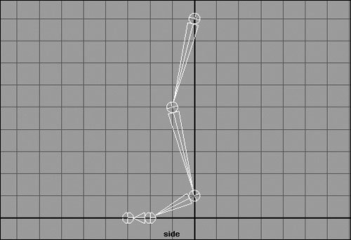 | Tips It's often a good idea to build a skeleton with grid snap turned on so that all your joints are securely aligned. A convenient way to do this is by holding down when you place joints. You can make the joints appear bigger or smaller by selecting Display > Joint Size and choosing a size from the list. To delete a joint, select the joint and then press . That joint is deleted along with any joints below it in the hierarchy. To parent joints: 1. | Create the skeleton of a leg and foot out of five joints in the Side view (Figure 10.6).