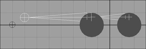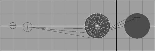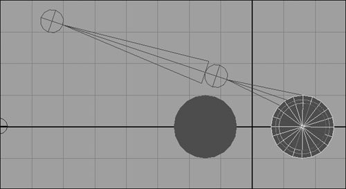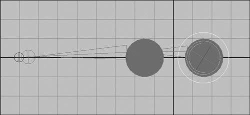 | Models alone can be difficult to pose. They often have too many parts to position properly (such as a tank), or too few (such as a character made from one poly mesh). To help with this issue, animators often build a control structure with which to pose their model. This control structure is referred to as a rig, A rig is usually constructed from joints, curves, and the model itself. Constraints, connections, and parenting are all used to control the behavior of the rig. In a typical rig, geometry is attached to joints, and the motion of those joints is limited through constraints and connections. Additional elements are often brought into the rig, such as NURBS curves. These curves are then linked to the rest of the rig and used by the animator to pose the model. These curves are often referred to as controls. Using controls, you simplify the number of objects you must move to pose the character. Also, since you are not manipulating the joints directly, you can hide the skeleton of the character to avoid accidentally selecting it. One common use of a rig is to automate behavior that you don't wish to animate, such as the movement of machine parts. You can use constraints and connections to ensure accurate driven motion, such as on the wheels of a locomotive. To rig a drive shaft: 1. | From the Front view, create two NURBS or poly wheels, and rotate them so they stand on edge (Figure 10.49).