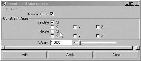 Figure 10.52. An aim constraint drives rotation channels and would conflict with a parent constraint by default. Removing the rotation channels from the parent constraint allows them to be controlled by the aim constraint without conflicting.  | 7. | Select joint4, -select joint2, and choose Constrain > Aim.