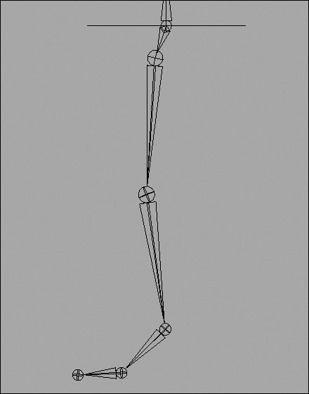 Figure 10.72. Keep the legs straight, and try not to have the knee bend backward; otherwise, the default interpolation may be reversed (and painful looking).  Make sure the bones line up from the Front view as well.