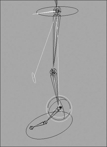 Figure 10.53. The left-hand wheel is rotated slightly here. The aim constraint only adjusts rotation; so, the driveshaft bone maintains its length while it always aims toward joint4, where the piston would lie.  | 8. | Create a NURBS circle for use as a control curve, and position it over the right wheel.